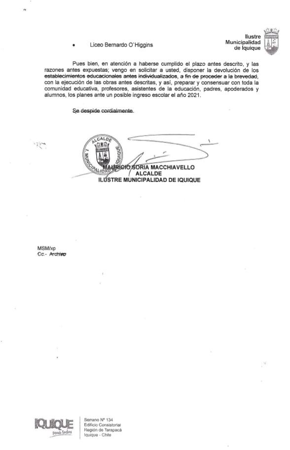 Mediante el Ordinario N°667 el alcalde de Mauricio Soria Macchiavello, en su calidad de presidente del directorio de la Corporación Municipal de Desarrollo Social de Iquique, solicitó a la Jefatura de la Defensa Nacional en Tarapacá la devolución de las escuelas y liceos que, hasta ahora, están siendo utilizadas como residencias transitorias para aquellas personas que no tienen donde realizar sus cuarentenas sanitarias, en el contexto de la pandemia por el Covid-19.