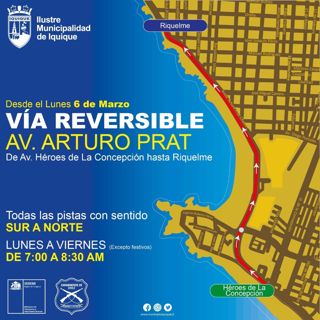 Para mejorar el tráfico vehicular hacia el centro de Iquique las 4 PISTAS de AVENIDA ARTURO PRAT, entre AVENIDA HÉROES DE LA CONCEPCIÓN (Sector Ex Mango’s) y calle ERNESTO RIQUELME (Sector Piscina Municipal Alcalde Godoy) tendrán SENTIDO SUR-NORTE de 7:00 a 8:30 DE LA MAÑANA…