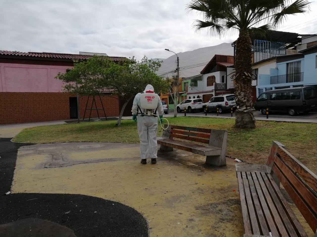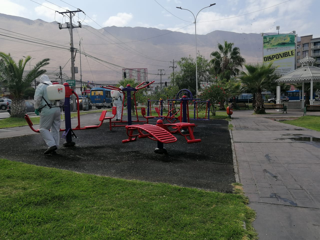 Para evitar posibles fuentes de contagio de Covid-19 y entregar seguridad a las iquiqueñas, iquiqueños y usuarios de los espacios públicos de la ciudad, es que la Dirección de Medioambiente de la Municipalidad de Iquique, comenzó un proceso de sanitización con amonio cuaternario, sustancia química que mata virus y bacterias, no es tóxico ni daña plantas ni animales.