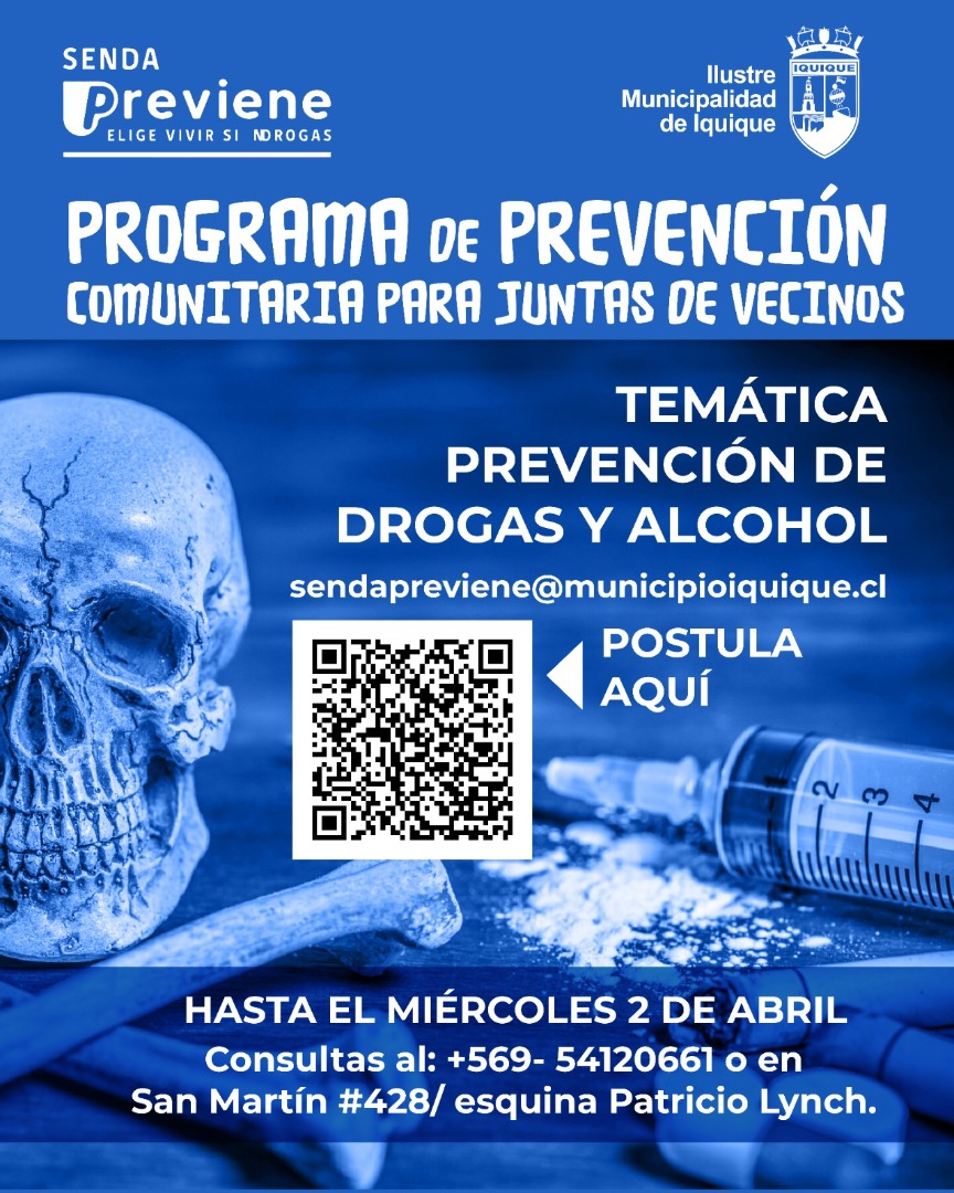 Para formar parte de esta estrategia de la Oficina de Senda Previene de la Municipalidad de Iquique, las Juntas de Vecinos deberán postular hasta el MIÉRCOLES 2 DE ABRIL, llenando el siguiente formulario: https://docs.google.com/forms/d/1rMlujV5yGOpczF-pafLeZ57eC1wF96AeBFdIbNWYiF4/viewform?edit_requested=true , al que también se puede acceder escaneando el QR inserto en la imagen.